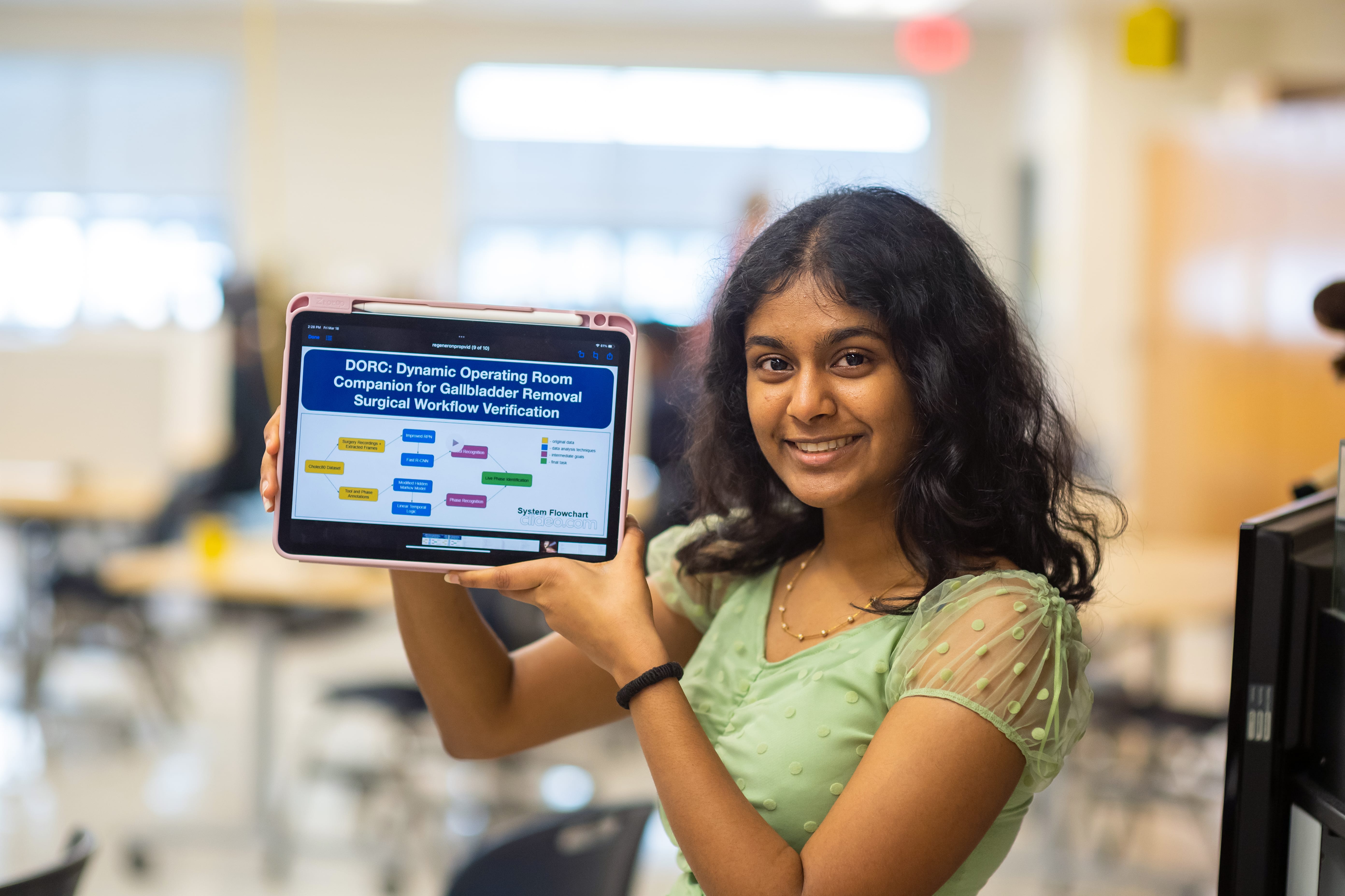 Pravalika started working on Dynamic Operating Room Companion (also known as DORC) in July 2020 and her goal was to reduce the potential for mistakes in gallbladder surgeries. Using machine learning, DORC analyses live surgery videos and tracks the movements of surgical tools, such as the acceleration and velocity in use. DORC uses this info to flag potential errors.