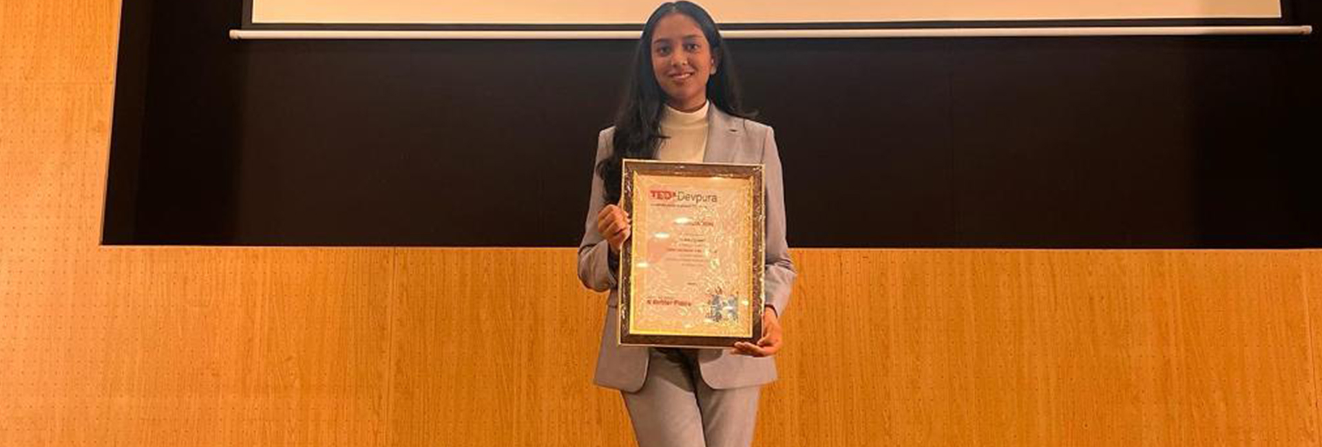 With several internships in various sectors- banking, finance, management, sustainability, she is also a TEDx Speaker.
